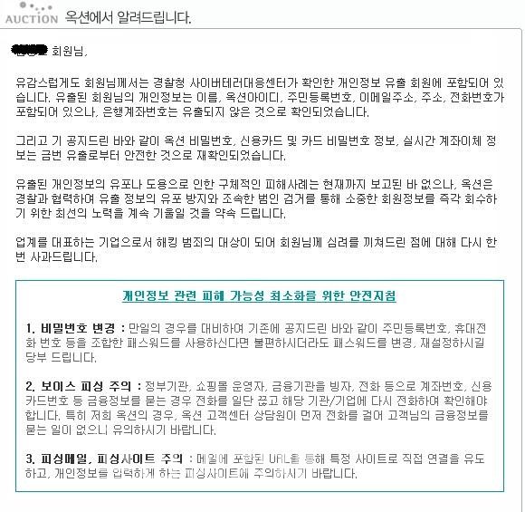 옥션측은 경찰청 사이버테러대응센터 조사 결과 개인정보 유출 회원 1081만명 중 90%인 970만여명은 이름과 아이디 주민등록번호 주소 전화번호 등 일반 정보가 유출됐고 110만여명은 거래정보와 환불정보 까지 유출된 피해라고 발표했다.