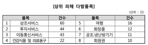최근 3년간 홍보관 상술로 피해가 가장 많았던 품목은 상조서비스(60건)로 나타났으며, 이어 투자서비스(44건), 이동통신서비스(43건) 순이었다. 과거 건강식품에 국한됐던 피해품목이 최근 다양한 서비스까지 확대된 것이다.