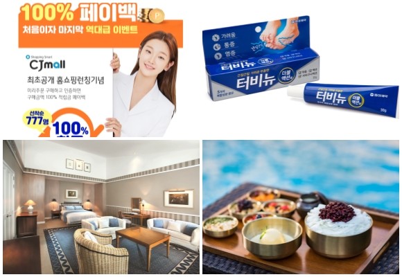 (왼쪽부터 시계방향) 닥토락토 세븐배리어 버블 클렌저, 동아제약 터비뉴더블액션겔, 롯데호텔제주 여름 프로모션, 제주신라호텔 로맨틱 허니문 패키지. ⓒ 각 사