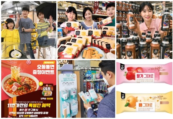 (왼쪽부터 시계방향) 홈플러스 펭수 우산·브리티시 쇼트브레드·스위트 아메리카노, 이마트24 과일바 아이스크림 2종·부스터덴탈케어 론칭, 11번가 오동통면 맛남의 광장 한정판. ⓒ 각 사