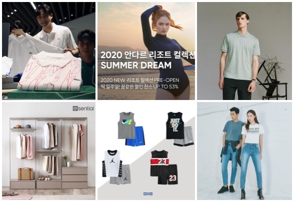(왼쪽부터 시계방향) 신세계백화점-라코스테 협업 스포츠 의류 선봬, 안다르 래쉬가드, 유니클로-띠어리 '협업' 제품, 버커루 2020 쿨맥스 데님, 나이키·조던 키즈 상하의세트 출시, 앳센셜 스마트 모듈 가구. ⓒ 각 사