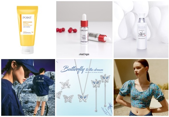 (왼쪽부터 시계방향) 포인트 딥 클린 비타 휩 클렌징 폼, 뉴오리진 뉴오리진 까무까무 에너지 C 세럼, 생그린 순백미인 RX 화이트 토너, 앳코너 에코 스윔웨어 컬렉션, 클루 모르포나비 모티브 신상품 출시, 롯데백화점 아식스·아이앱 스튜디오 협업 제품. ⓒ 각 사