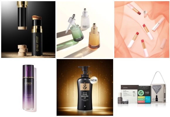 (왼쪽부터 시계방향) 오휘 얼티밋 커버 스틱 파운데이션, 숨37° 로시크숨마 앰풀 프로그램, fmgt 잉크 쉬어 매트 립스틱, 프리메라 슈퍼 블랙 씨드 콜드-드랍 세럼 리미티드 세트, 려 프리미엄 탈모증상케어 라인, 리리코스 마린에너지 캘러스 파워 스킨·에멀젼. ⓒ 각 사