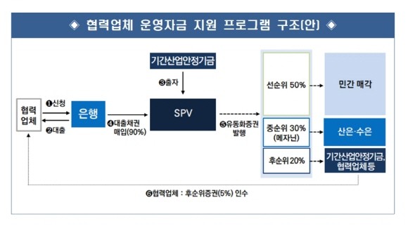 협력업체가 대출을 신청하면 은행은 지원 자격 심사 후 대출을 실행한다. 기간산업안정기금이 출자해 만든 SPV는 은행으로부터 협력업체 운영자금 대출채권을 매입한다.
