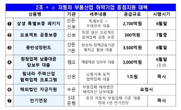 우선 정책금융기관과 완성차업체가 함께 조성한 '동반성장펀드'를 통해 산업·기은에서 각각 1750억원 규모의 대출이 이뤄진다. 이는 완성차 업체가 추천하는 중소·중견 협력업체가 지원 대상으로, 은행에서 심사 후 신용도 취약 업체를 우선 지원할 예정이다.