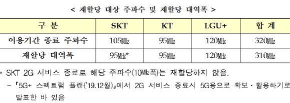 반면 SK텔레콤 2G 서비스 종료로 해당 주파수(10㎒폭)는 재할당하지 않고 5G용으로 확보·활용하기로 했다.