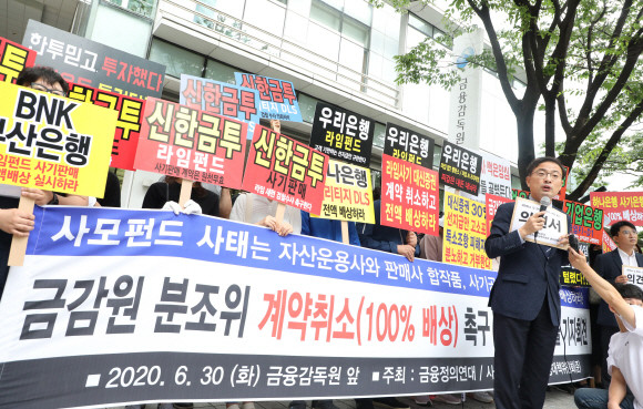 금융정의연대와 사모펀드 피해자 공동대책위 관계자들이 지난달 30일 여의도 금융감독원 앞에서 사모펀드 책임 금융사 징계 및 배상 촉구 기자회견을 하고 있다. © 연합뉴스