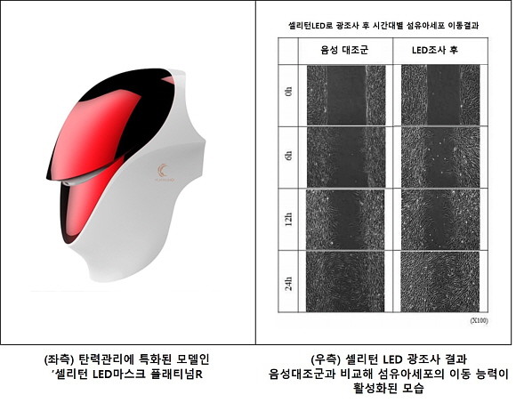 시험 결과, 셀리턴 LED를 사용한 레드 및 근적외선 파장을 피부세포에 조사했을 때 섬유아세포의 이동과 증식이 촉진되고 프로콜라겐의 합성을 돕는 결과를 확인했다.