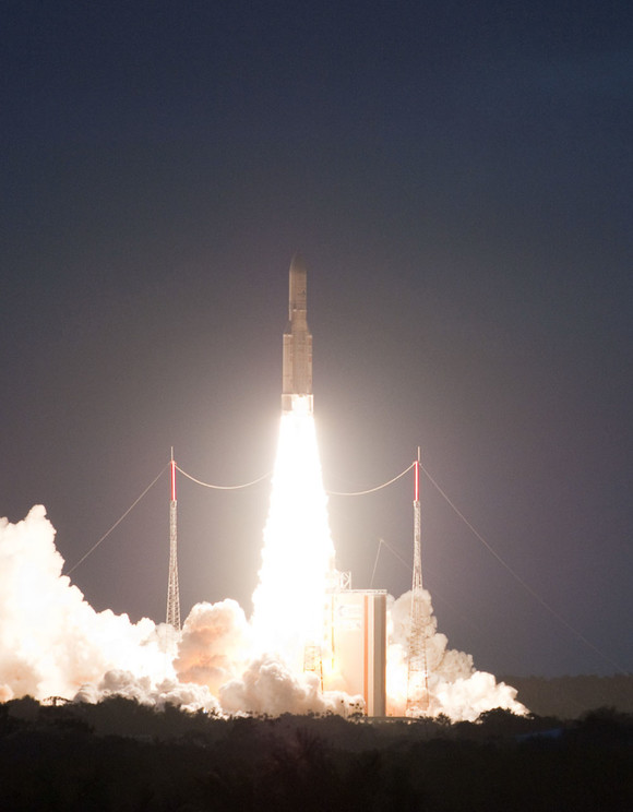국내 연구개발에 의해 제작된 첫 정지궤도 위성인 천리안 위성을 탑재한 아리안-5ECA 발사체가 2010년 6월27일 오전 6시41분(현지시각 26일 오후 6시41분) 남미 프랑스령 가이아나우주센터에서 발사되고 있는 모습. ⓒ 연합뉴스