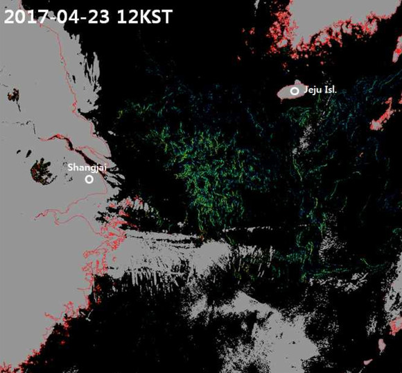 천리안 해상관측위성이 지난 2017년 4월23일 촬영한 괭생이 모자반 사진. 초록색을 띤 것들이 괭생이 모자반. ⓒ 연합뉴스