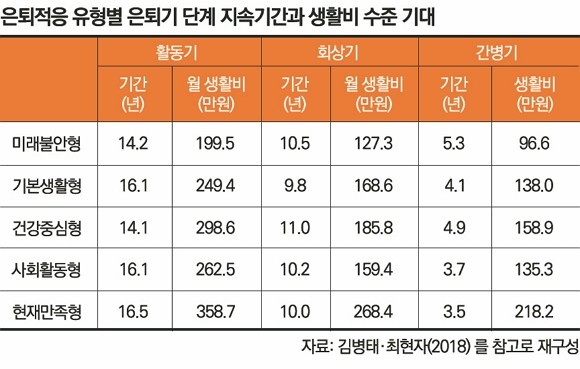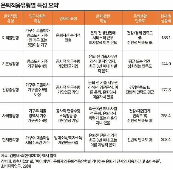 김병태 한국 FPSB 박사와 최현자 서울대학교 교수는 베이비부머의 '은퇴적응유형'을 △미래 불안형 △기본 생활형 △건강 중심형 △사회 활동형 △현재 만족형 등 5가지로 구분했습니다.