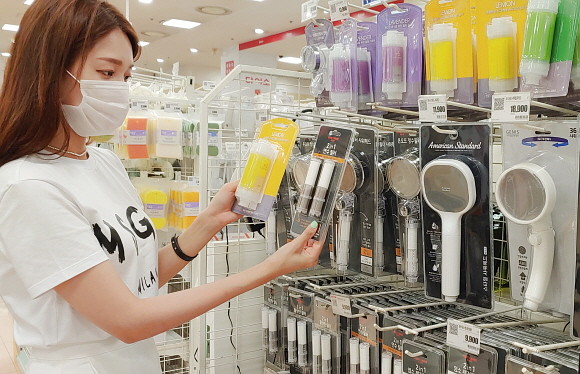 롯데마트가 '룸바이홈 2in1 필터' 출시했다. 사진은 롯데마트에서 고객이 정수필터를 살펴보는 모습. © 롯데마트