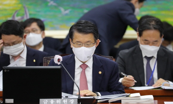 은성수 금융위원장이 29일 오전 서울 여의도 국회에서 열린 정무위원회 전체회의에서 자료를 살피고 있다. © 연합뉴스