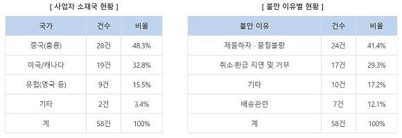 피해가 접수된 해외사업자 소재국은 중국·홍콩(28건·48.3%), 미국·캐나다(19건·32.8%), 유럽(9건·15.5%) 등의 순이었다. 불만 이유로는 '제품하자·품질불량'이 24건(41.4%)으로 가장 많았고 '취소·환급 지연 및 거부'가 17건(29.3%)으로 뒤를 이었다. 배송 관련 불만도 7건(12.1%)이 접수됐다.