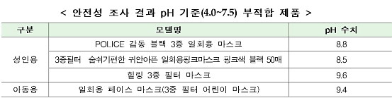 이번 조사로 리콜 권고를 받은 제품은 △POLICE 감동 블랙 3중 일회용 마스크(pH 8.8) △3중필터 숨쉬기 편한 귀 안 아픈 일회용 핑크마스크 핑크색 블랙 50매(pH 8.5) △힐링 3중 필터 마스크(pH 9.6) △일회용 페이스 마스크(3중 필터 어린이 마스크·pH 9.4)다.