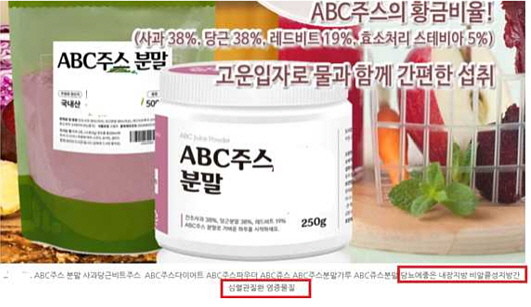 ABC주스란 사과(Apple), 비트(Beet), 당근(Carrot)을 원료로 제조한 과·채음료 등의 식품이나, 건강정보 프로그램을 통해 '다이어트' '해독작용' 등 효능·효과를 표방해 광고 중이다.