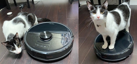 로보락 S6 MaxV 위에 올라탄 복돌이는 마치 소설 동백꽃 점순이처럼 "너네 집엔 이런 거 없지?"라고 말하는 듯했다. = 박지혜 기자