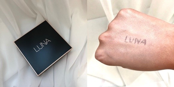 루나 롱래스팅 컨실웨어 쿠션과 아이라이너로 LUNA라는 문구를 쓰고 그 위에 팩트를 찍어 본 모습. = 김다이 기자