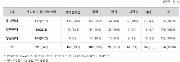 피해구제가 신청된 사건 중 판매방법 확인이 가능한 856건을 분석한 결과 '통신판매'가 61.2%(524건)로 가장 많았고, 다음으로 '일반판매' 19.9%(170건) '방문판매' 18.9%(162건) 순이었다.
