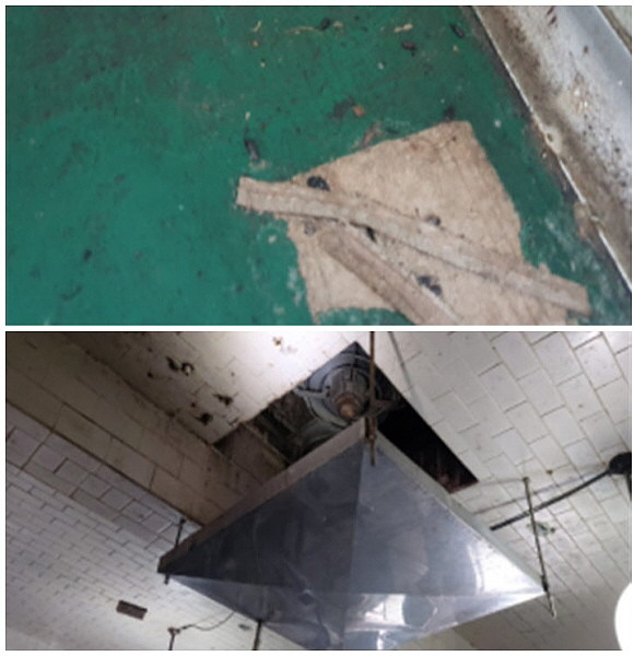 주요 위반내역 사진. 작업장 내 쥐 배설물(사진 위), 작업장 천정 환풍기 찌든 때와 곰팡이. © 식약처