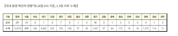 중앙방역대책본부는 16일 0시 기준으로 267명의 지역발생 확진자가 생겼다고 발표했다. ⓒ 중앙방역대책본부
