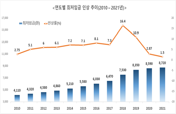 최저임금을 심의·의결하는 사회적 대화 기구인 최저임금위원회는 지난 7월14일 새벽 정부세종청사에서 진행한 9차 전원 회의에서 내년도 최저임금을 시급 기준 8720원으로 의결했습니다. 올해 8590원보다 130원(1.5%) 오른 금액으로 1988년 이후 IMF 시기인 1997년(2.7%), 금융위기 2010년(2.75%) 인상률보다 낮은 수준인데요. 월급(주 40시간 기준)은 182만2480원입니다.