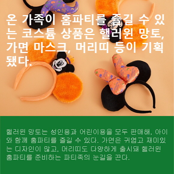 2000원 이하의 상품이 80% 이상으로 다양한 연령에서 가성비 높게 핼러윈을 즐길 수 있도록 구성했고 파티용품, 코스튬 용품, 디즈니 핼러윈 상품 등 총 240여 종 상품을 준비했다.