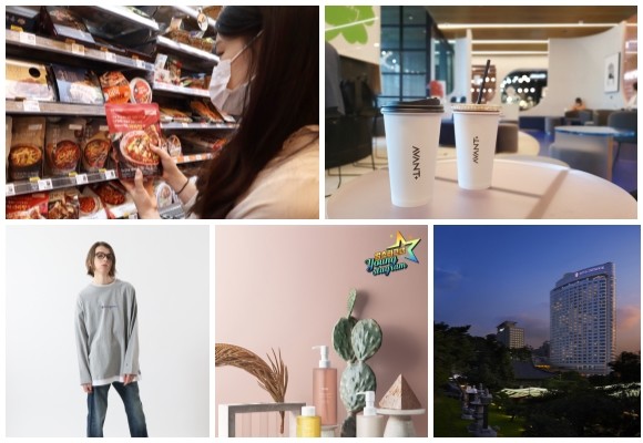 (왼쪽부터 시계방향) 이마트24 피코크 상품 라인업 강화, HDC아이파크몰 커피 구독 서비스, GS샵 인터컨티넨탈 서울 코엑스 호텔 패키지, 현대홈쇼핑 헉슬리 바디트리오 4종 세트, 챔피온 캠퍼스 라인. © 각 사