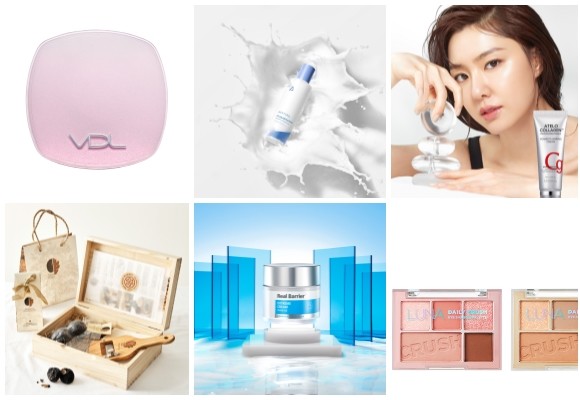 (왼쪽부터 시계방향) VDL 엑스퍼트 멀티 커버 톤업 쿠션, 에스트라 아토베리어365 하이드로 에센스, 미샤 아텔로 콜라겐 500 파워풀럼핑 크림, 루나 데일리 크러쉬 아이 섀도우 팔레트, 리얼베리어 익스트림 크림, SSG푸드마켓 송로버섯 세트. © 각 사