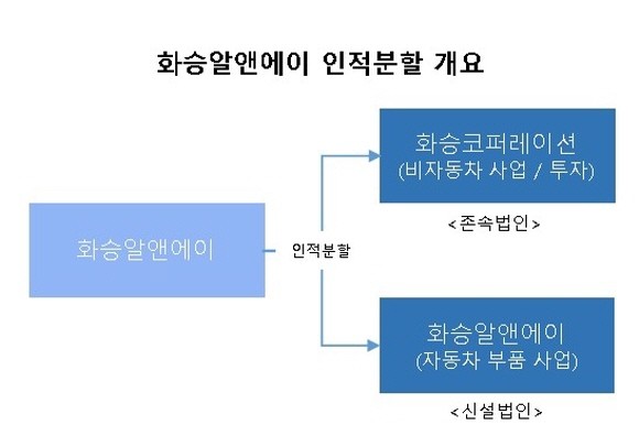 자동차 핵심 부품 전문 기업 화승알앤에이는 28일 이사회를 열고 현재 법인을 사업과 투자를 맡는 존속법인 '화승코퍼레이션'과 자동차 부품 사업 전문 신설법인 '화승알앤에이'로 인적분할을 결정했다고 이날 공시했다.