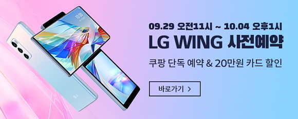 쿠팡은 오는 29일 오전 11시부터 10월4일 13시까지 LG전자의 신제품 LG Wing(LG 윙) 사전예약을 이커머스 중 단독으로 진행한다.