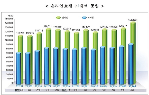 5일 통계청이 발표한 '8월 온라인쇼핑 동향'에 따르면 지난 8월 PC와 모바일을 통해 이뤄진 인터넷 쇼핑 거래금액은 14조3833억원으로 1년 전보다 27.5% 증가했다. 이는 7월 거래액 12조9819억원에 비해서도 1조원 넘게 늘어난 수치로, 온라인쇼핑 월별 거래액이 14조원을 넘어선 것은 처음이다.