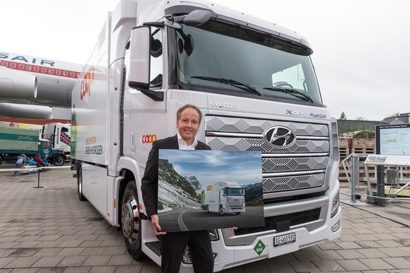 엑시언트 수소전기트럭 차량 앞에서 스위스 고객사 Coop 관계자가 기뻐하는 모습. ⓒ 현대자동차