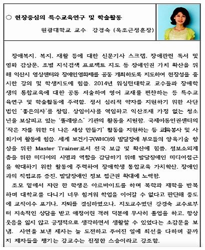 전북 익산 소재 원광대학교(총장 박맹수)에서 중등특수교육과 교수로 재직 중인 강경숙 교수(53)는 교육소외 및 격차 해소에 관심이 많아 관련 주제의 연구와 다양한 사회활동에 매진하고 있다. 특히 발달장애인과 함께 쉬운 말 뉴스와 문서 만들기 캠페인에 힘을 보태는 등 휴먼에이드 활동도 꾸준히 함께 해오고 있다.