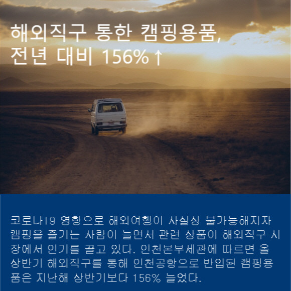 [프라임경제] 신종 코로나바이러스 감염증의 영향으로 해외여행이 사실상 불가능해지자 캠핑을 즐기는 사람이 늘면서 관련 상품이 해외직구 시장에서 인기를 끌고 있다. 인천본부세관에 따르면 올 상반기 해외직구를 통해 인천공항으로 반입된 캠핑용품은 지난해 상반기보다 156% 늘었다.