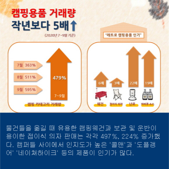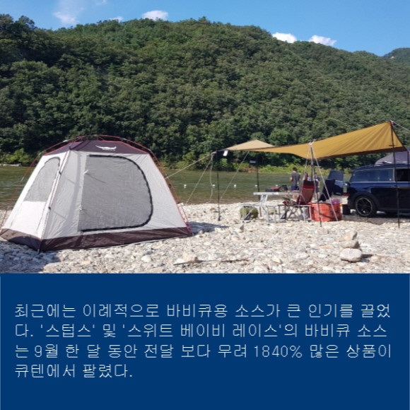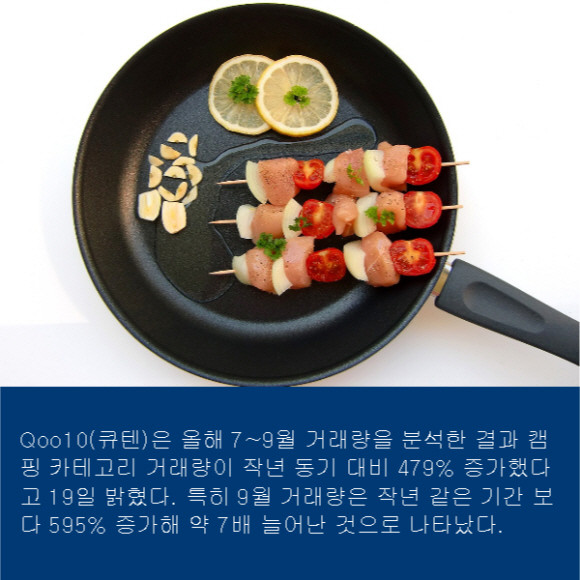 글로벌 쇼핑 플랫폼 Qoo10(큐텐, 대표 구영배)은 올해 7~9월 거래량을 분석한 결과 캠핑 카테고리 거래량이 작년 동기 대비 479% 증가했다고 19일 밝혔다. 특히 9월 거래량은 작년 같은 기간 보다 595% 증가해 약 7배 늘어난 것으로 나타났다.