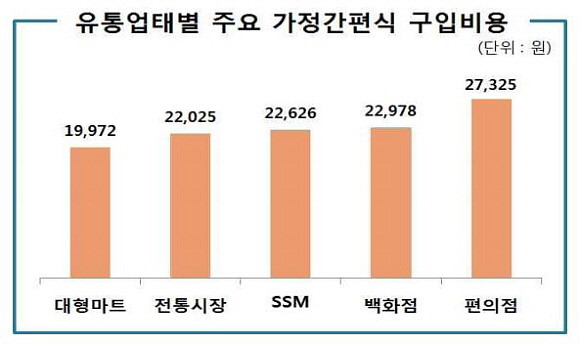 품목별로 주요 상품을 선정해 10개 상품의 총 구입비용을 업태별로 비교한 결과, 대형마트(1만9972원), 전통시장(2만2025원), SSM(2만2626원), 백화점(2만2978원), 편의점(2만7325원) 순으로 저렴한 것으로 조사됐다. 대형마트가 편의점보다 26.9%, 백화점보다 13.1% 더 저렴했다.