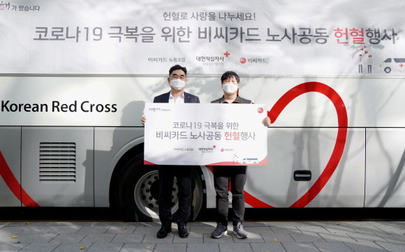 BC카드가 지난 4일 코로나19 위기 극복과 임금협약 무교섭 타결을 기념해 '노사 공동 헌혈 행사'를 진행했다. 이동면 사장(좌측)과 두성학 노조위원장(우측)이 기념촬영을 하고 있다. © BC카드
