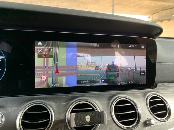 더 뉴 E 350 4MATIC AMG 라인의 필살기 중 하나는 모델 최초로 적용된 증강현실(AR) 내비게이션이다. 12.3인치 디스플레이로 보이는 AR 내비게이션은 직관적이고 효과적인 경로안내를 제공해주긴 하는데, 다소 낯설어 적응시간이 필요했다.