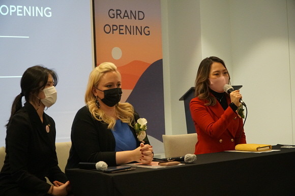 더위크앤리조트 이현지 대표를 비롯한 더위크앤 관계자들이 기자 간담회에서 리조트 설명을 하고 있다. (왼쪽부터) 문지연 더위크앤리조트 코디네이터, 밀리짜 마르코비치 (Milica Markovic) 총지배인, 이현지 더위크앤리조트 대표. © 트리니티디앤씨