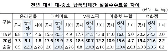 대·중소기업 간 실질수수료율 격차가 가장 큰 업태는 TV홈쇼핑으로 12.2%포인트(p)였다. 가장 낮은 업태는 온라인쇼핑몰(1.8p)이었다. 아울렛·복합업체(4.7%p), 대형마트(2.3%p), 백화점(2.2%p)등에서도 차이가 났다.