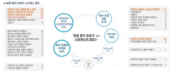 중증질환 환자의 스트레스 원인으로 '보호자가 일상 생활을 할 수 없다(15%)' '보호자가 육체적으로 피곤하다(14%)' 등의 신체적 어려움과 함께 '보호자가 정신적으로 힘들다(11%)' '환자의 고통받는 모습을 봐야한다(11%)'의 정신적 고통과 자책감을 느끼는 것으로 확인됐다.