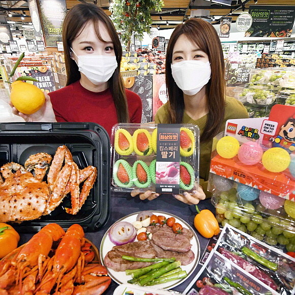 우선 23일까지 온 가족이 함께 즐길 수 있는 신선 먹거리를 저렴하게 내놓는다. 2.8kg 내외 자이언트 킹크랩(마리, 러시아산), 960g 내외 점보 랍스터(마리, 캐나다산), 300g 내외 킹 블랙타이거 새우(3마리, 말레이시아산) 등을 만나볼 수 있다. 제철 활방어회(200g), 생연어도 초특가에 마련했다.