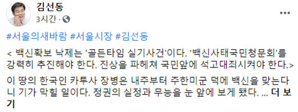 지난 10일 서울시장 보궐선거 예비후보 등록한 김 전 사무총장은 24일 본인의 SNS 계정으로 "이 땅의 한국인 카투사 장병은 내주부터 주한미군 덕에 백신을 맞는다니 기가 막힐 일"이라며 "정권의 실정과 무능을 눈앞에 보게 됐다"고 밝혔다.