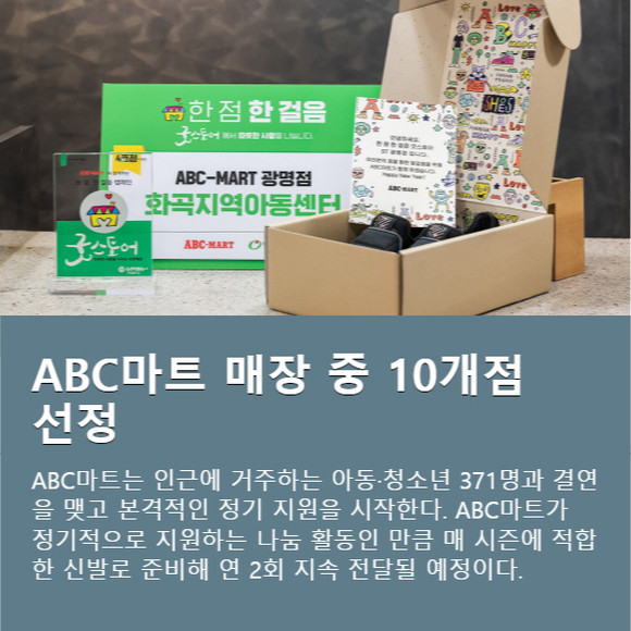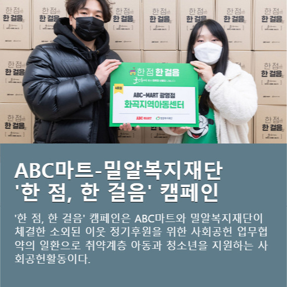 [프라임경제] ABC마트가 사회복지법인 밀알복지재단(이사장 홍정길)과 함께 복지사각지대에 놓인 아동과 청소년의 꿈을 응원하는 '한 점, 한 걸음' 캠페인을 시작한다. 이번 캠페인을 통해 ABC마트는 밀알복지재단과 함께 지정한 ABC마트 매장 중 먼저 10개점을 선정해 인근에 거주하는 아동·청소년 371명과 결연을 맺고 본격적인 정기 지원을 시작한다.