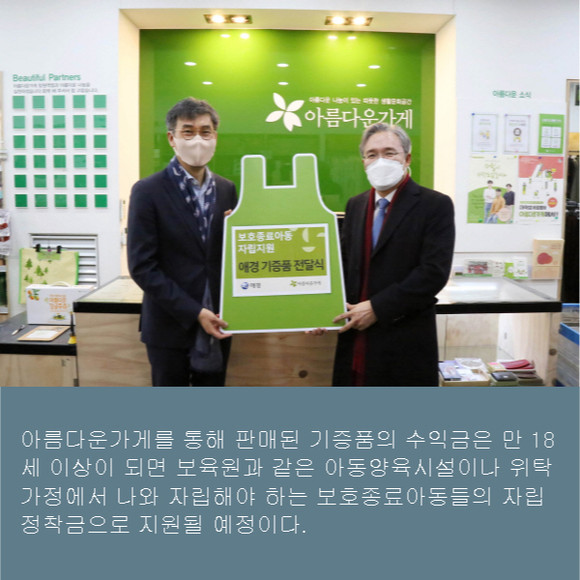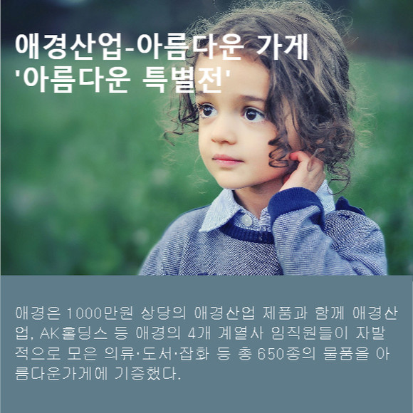 애경은 지난 13일 재단법인 아름다운가게와 함께 '나눔과 순환'을 위한 기부행사 '아름다운 특별전'을 진행, 1000만원 상당의 애경산업 제품과 함께 지난해 12월초부터 2주간 애경산업, AK홀딩스 등 애경의 4개 계열사 임직원들이 자발적으로 모은 의류·도서·잡화 등 총 650종의 물품을 아름다운가게에 기증했다.