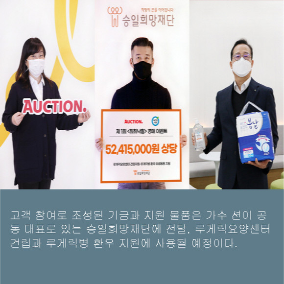 또한 옥션이 '깨끗한나라'와 함께 루게릭병 환우를 위해 진행한 기부 캠페인 '희희낙찰'을 통해 총 5200만원 상당의 기금과 물품을 승일희망재단에 전달했다. 고객 참여로 조성된 기금과 지원 물품은 가수 션이 공동 대표로 있는 승일희망재단에 전달, 루게릭요양센터 건립과 루게릭병 환우 지원에 사용될 예정이다.