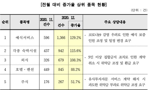 예식서비스는 코로나19 감염 우려로 인한 예식 보증인원 조정 또는 일정 변경 요구가 많았다. '각종 숙박시설'과 '외식'은 5인 이상 집합금지 조치로 인한 계약 취소 시 과도한 위약금이 부과돼 소비자 불만이 증가했다.