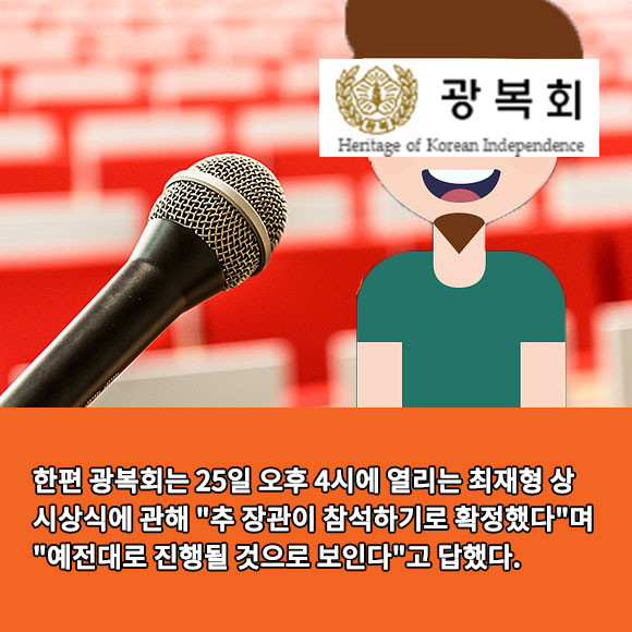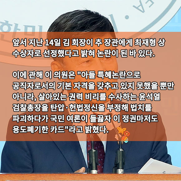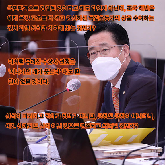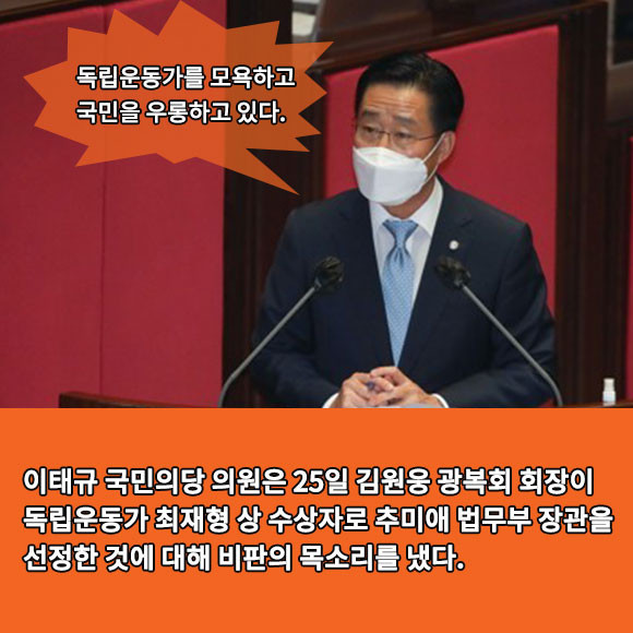 [프라임경제] 광복회 주관으로 25일에 열릴 시상식에서 추미애 법무부 장관이 독립운동가 최재형 상을 받는 것에 대해 이태규 국민의당 의원이 비판의 목소리를 냈다.