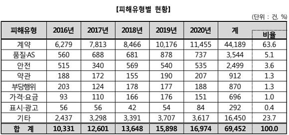피해유형별로는 계약불이행·계약해제·해지·위약금 등 '계약'  관련 피해가 63.6%(4만4189건)로 가장 많았고, 다음으로 '품질· AS' 관련이 5.1%(3544건), '안전' 관련이 3.6%(2499건) 등의 순이었다.